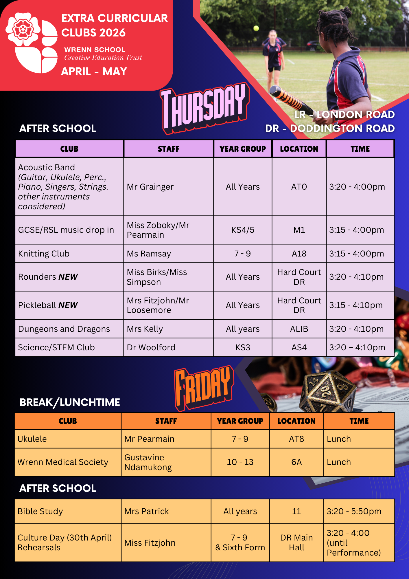 Wrenn offers a wide range of Extra Curricular events, both at lunch time and after school.
